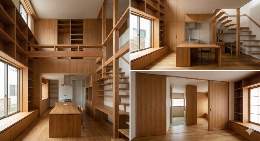 引き戸の多用: 開き戸は開閉のスペース(軌跡)が必要なため、狭小地ではデッドスペースを生みます。極力引き戸を採用し、普段は開け放してワンルームのように使い、必要な時だけ仕切れるようにします。
