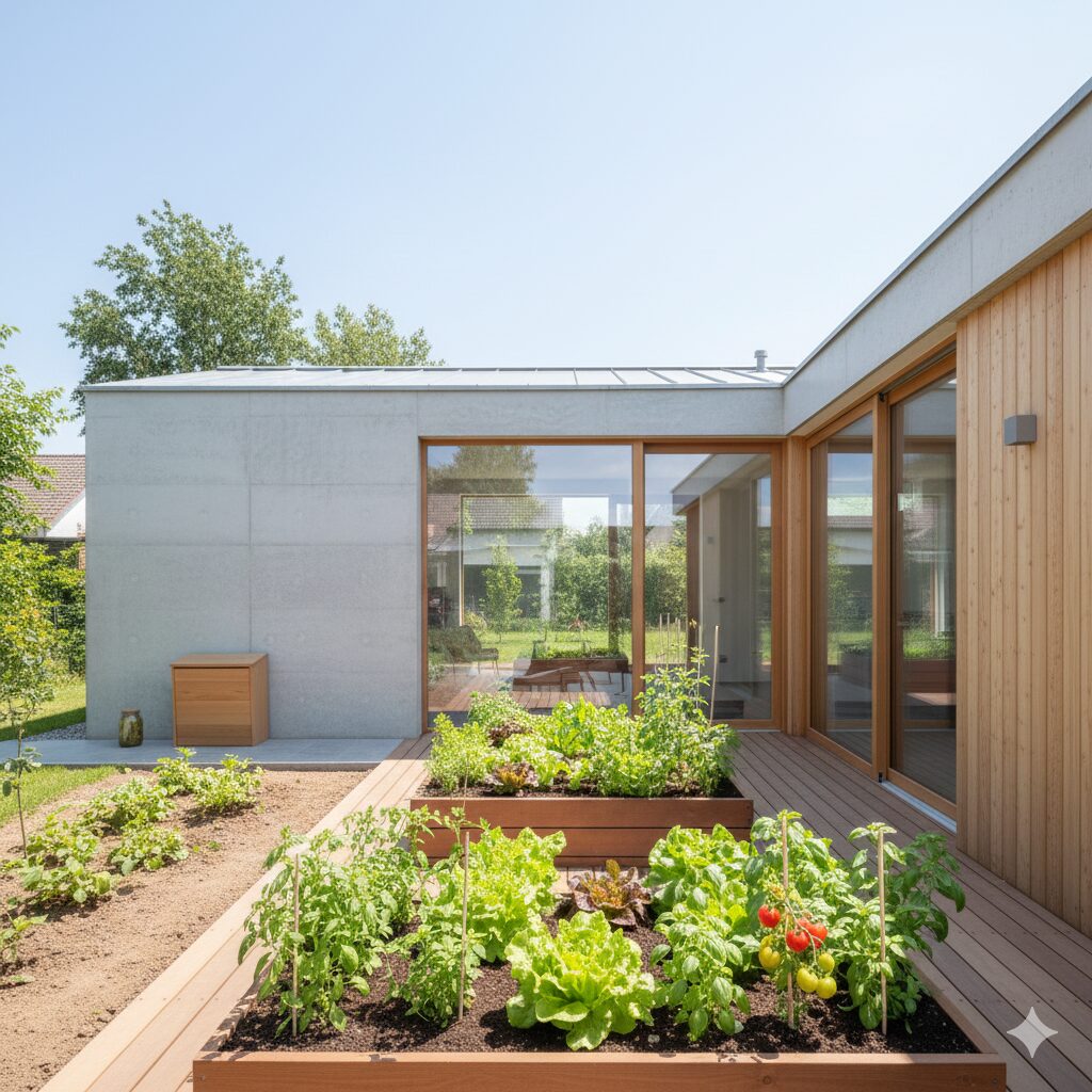 キッチン直結のテラス菜園: キッチンから勝手口を開けたら、そこがハーブ園やサラダガーデン。調理中に「あと一振り」のミントやパセリをその場で摘む暮らし。
